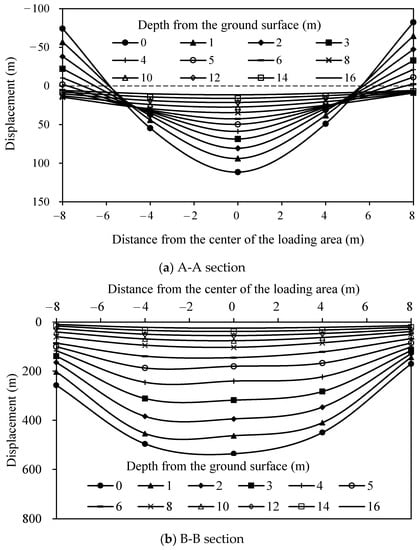 - The corner of the loading area developed large uplift deformation. The uplift deformation only happened within a shallow depth of 6 m for the foundation soil at the short edge of the loading area. The foundation soil at the center section always developed downward displacement at different depths.