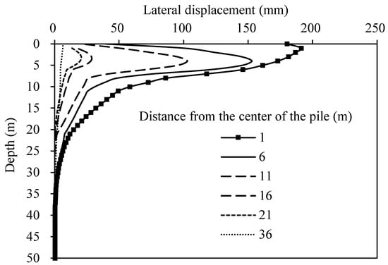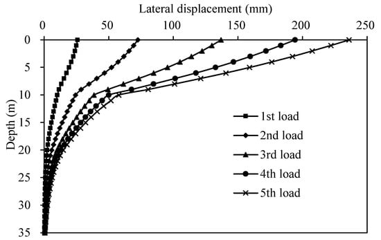 - The pile developed large lateral displacement for a shallow depth of 10 m. The lateral displacement decreased sharply with the increase in depth and increased with the placement of the new lift loading. The foundation soil developed the maximum lateral displacement at depths varying from 1 to 4 m in different cases instead of the ground surface. The lateral displacement of the soil was slight when the depth exceeded 30 m.