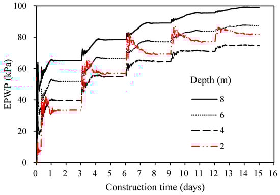 - The EPWP initially increased significantly after the placement of the 1st lift loading. The increment of the EPWP was not linear with the increase of the surcharge load. The value of the EPWP continued to increase and accumulated with the placement of the new lift loading.
