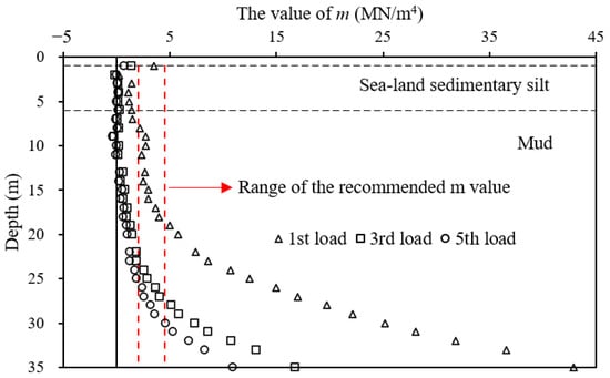 - The m value in the shallow soil layer was typically smaller than the lower limit of the recommended value, while the m value in the deep soil layer was significantly higher than the upper limit of the recommended value. The value of m decreased with the increase of the surcharge load. The design code overestimated the horizontal resistance of the shallow foundation soil at a high surcharge load and large lateral displacement.