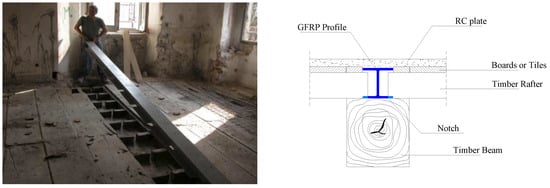 The static loads considered in the past in design were markedly smaller. Furthermore, modern building codes require significantly higher safety factors compared to the ones used in the pre-industrial period. In this situation, structural engineers can opt for the replacement or reinforcement of existing timber beam floors. Replacing timber floors with reinforced concrete (RC) has been commonly used in the second half of the 20th century in many European countries []. However, recent seismic events [,,] have clearly demonstrated its weakening effect.