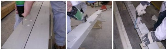 Before application, the GFRP profiles were notched with a spacing of 500 mm. This was necessary to simulate, in a real-case scenario, the constraint of the timber rafters (Figure 4). The dimensions of the notches were 80 × 30 mm. Notching is relatively simple, and it can be done on-site. Initially, 3 mm diameter holes were drilled at the vertices of the rectangular-shaped notch, and an electric angle grinder and a hand hacksaw frame were subsequently used to remove the GFRP material. More details of the experimental method are reported in [].