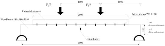 The joints between the timber beams and the GFRP profiles were made using an epoxy resin (bonded joint) and 10 mm diameter metal screws with a spacing of 250 mm (Figure 5). After the resin had cured (72 h), screws were installed to strengthen the GFRP profiles. Thus, the beams acted compositely with the load transferred between them by a combination of shear stresses (parallel to the joint) and peel stresses (normal to the joint).