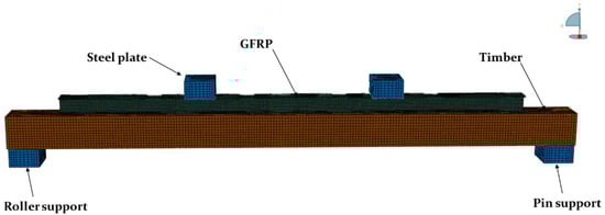 The FEM of the GFRP pultruded reinforced timber beam was developed using ABAQUS [] finite element software. This model consists of three independent parts, which are a white fir timber beam, a GFRP pultruded beam, and 4.8-type [] steel screws and steel plate (used for loading and support) (Figure 7). The model was validated against the experimental tests by Corradi and Borri []. The displacement-controlled load was applied in the FEM. Based on the experimental tests, pin and roller support boundary conditions were applied in the FE model at the bottom of the support steel plate. This steel plate was modelled using an eight-node hexahedral brick element (C3D8R) with isotropic elastic material properties (i.e., Young’s modulus of 2.1 GPa and Poisson’s ratio of 0.3).