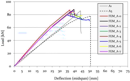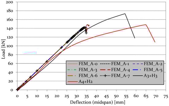 A comparison of the FE modelling results with the experimental results is discussed herein, emphasizing the flexural strength, load–displacement response, and failure modes. For the validation, bare white fir timber beams (A1, A5), and white fir timber beams with H-type GFRP pultruded reinforcement (A3 + H3, A4 + H2) were selected according to Corradi and Borri []. During the experiments, it was noticed that some of the timber beams had grain deviation (i.e., 1°–7°) between the fibre direction and the beam axis. Therefore, this study developed eight FEMs that also considered the angle of grain deviation () between the local (L) and global (z) axes. Table 4 illustrates the types of FEMs developed in this study.