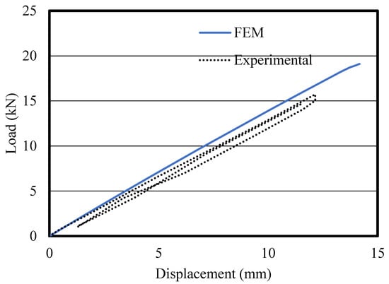 A comparison of the experiment and FEM of the elastic test results of the GFRP pultruded profile is depicted in Figure 11. It can be noticed that there was good agreement between the experimental and FEM stiffness, given by the slope of the lines in the bending load–deflection plot.