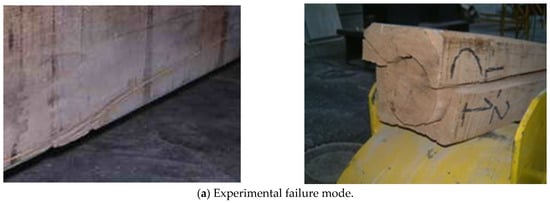 Comparison of failure modes between FEM and experimental test of unreinforced timber beam (stress values are in MPa).
