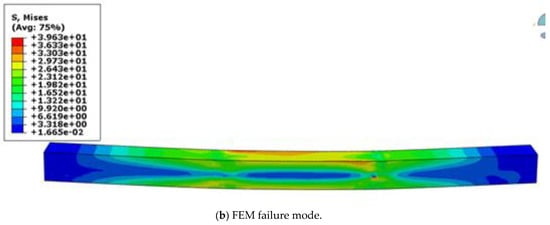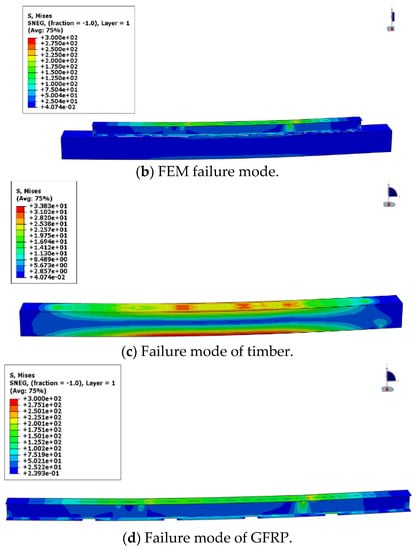 The failure modes in the FEMs were also compared with the experimental ones. Figure 13 compares the test and FEM failure modes for an unreinforced timber beam. Flexural tensile rupture was noticed in the experiments, and the FEM also yielded similar failure, as noticed from the von Mises stress distribution. The failure mode of the GFRP pultruded profile subject to flexure is presented in Figure 14. The comparison of the failure modes is shown in Figure 15. There was a clear tensile failure mode in the experiment, and a similar failure mode can also be observed in the FEMs based on the von Mises stress distribution.