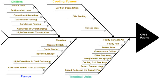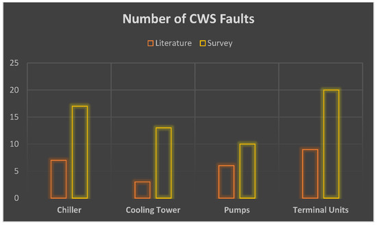 To summarise the CWS faults that were addressed in the SLR, a fish-bone diagram was prepared to highlight the same as shown in Figure 6. In contrast, the argument of the aforementioned SLR was proven here as the survey came up with more faults for each CWS component. The outcome provided the research community with seventeen (17) faults for chillers, thirteen (13) faults for cooling towers, ten (10) faults for pumps, and twenty (20) faults for terminal units. In this regard, Figure 7 illustrates the difference increment between the literature and the survey outcomes.