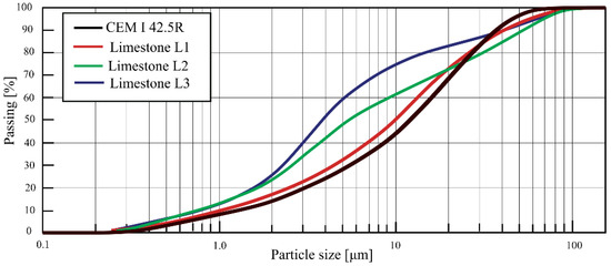 Portland cement CEM I 42.5R and three types of limestone were used in this study. The chemical compositions of all of the materials are shown in Table 1, while the particle size distribution is shown in Figure 1. All limestones used in the testing conformed to the requirements of the standard for the use of additives in cement and concrete [29]. The aggregate that was used for the tested concretes consisted of sand of fraction 0–2 mm and natural aggregate gravel of fractions 2–8 mm and 8–16 mm. In the case of vibrated concrete, an aggregate of up to 16 mm was used, while, for self-compacting concrete, fractions of up to 8 mm were used. The aggregates were chosen to comply with the requirements of PN-EN 206 + A1:2016-12 [29].