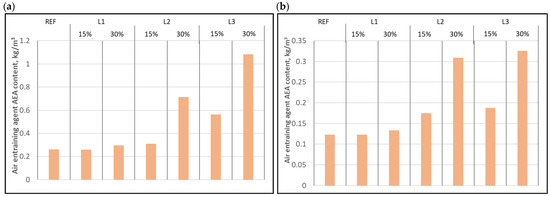Air content in the concrete mix for aerated concrete was set as 6% ± 1%, and the amount of air-entraining admixture (AEA) necessary to obtain it is shown in Figure 2.