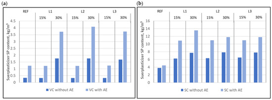 Due to the fact that consistency was set as 8–10 s according to the VeBe method for vibrated concretes, and, for self-compacting concrete, a spread of 65 ± 5 cm was applied, different amounts of superplasticizer had to be used for the tested concretes. The amount of superplasticizer necessary to obtain comparable consistency in the mixture is shown in Figure 3.