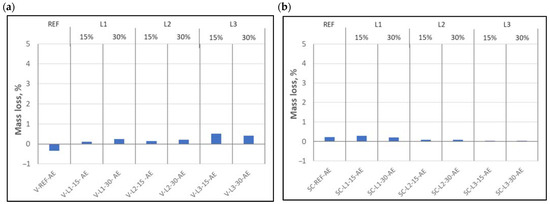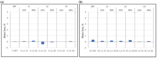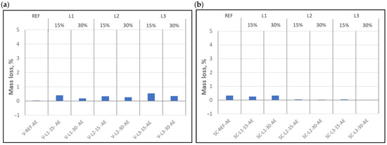 Mass loss of (a) vibrated and (b) self-compacting concrete with air-entraining admixture after 100 freeze–thaw cycles.