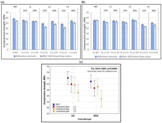 Differently than in the case of testing after 100 cycles of freeze–thaw, it could be observed that for 15% of limestone, the compressive strength loss for the majority of concretes is closer to the reference concrete’s mass loss than in the case of concretes with 30% of limestone addition. However, the differences are not significant, which is shown by the ANOVA analysis in Figure 17. It should be concluded that the amount of limestone does not affect, in a significant way, the freeze–thaw resistance of the concrete, especially in light of the fact that none of the tested concretes with limestone addition exhibited higher compressive strength loss than the limit of 20%.