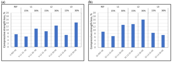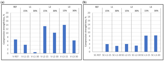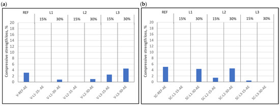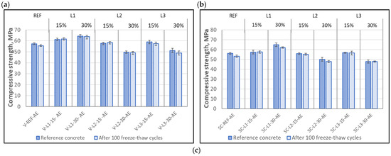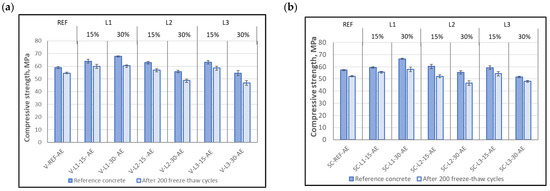 The results of tests of the compressive strength after 200 freeze–thaw cycles are presented in Figure 14, and in Figure 15, the compressive strength loss results are presented. Only air-entrained mixes were used for the testing.