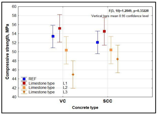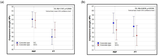 The concrete type did not affect the freeze–thaw resistance after 100 cycles—for both self-compacting and vibrated concrete, the compressive strength loss was comparable, which can be seen in Figure 13, showing the ANOVA analysis of the effect of concrete type on strength. It should be noted that the compressive strength of SCC was consistently slightly lower than in the case of the corresponding vibrated concretes, which may be connected with the higher air content. SCC mixes were characterized by 1% higher air content, which means higher porosity and thus lower compressive strength.