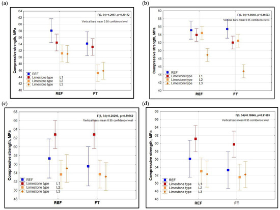 ANOVA analysis of the effect of limestone type on the compressive strength for reference samples (REF) and samples after 100 cycles of freeze–thaw (FT) for (a) vibrated concretes without AEA, (b) SCC without AEA, (c) vibrated concretes with AEA, (d) SCC with AEA.