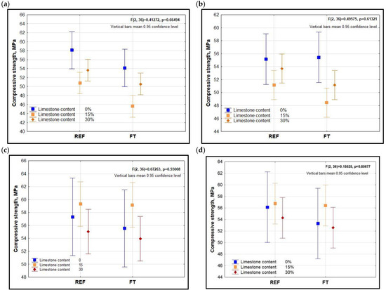 ANOVA analysis of the amount of limestone on the compressive strength for reference samples (REF) and samples after 100 cycles of freeze–thaw (FT) for (a) vibrated concretes without AEA, (b) SCC without AEA, (c) vibrated concretes with AEA, (d) SCC with AEA.