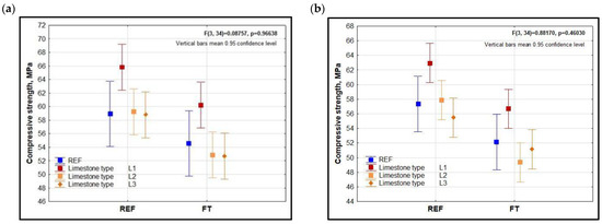 ANOVA analysis of the effect of limestone type on the compressive strength of reference concrete (REF) and concrete after 200 cycles of freeze–thaw (FT) for (a) vibrated concretes, (b) SCC.