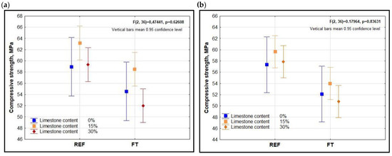 ANOVA analysis of the effect of limestone content on the compressive strength of reference concrete (REF) and concrete after 200 cycles of freeze–thaw (FT) for (a) vibrated concretes, (b) SCC.