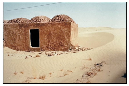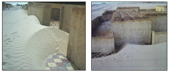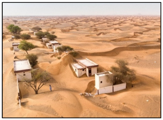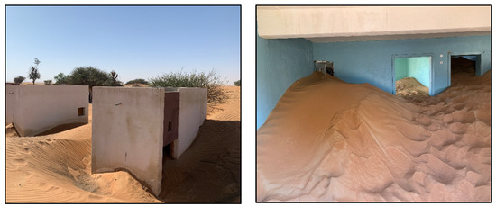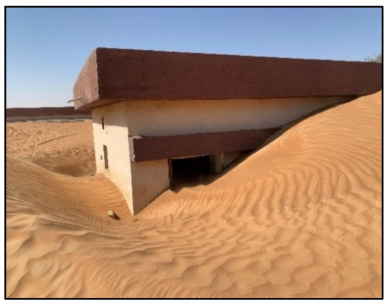 The town of Al Madam, also known as the “Buried Village”, was constructed around 1970 and is located approximately 50 km southeast of Dubai [39] (Figure 9). It was part of the government’s nationwide program to provide well-constructed and modern housing for the nomadic population [40]. Some of these new settlements were assembled very rapidly in locations close to active sand dunes (Figure 10). However, heavy sand encroachment and sand deposition around and inside the dwellings finally forced the inhabitants to abandon them (Figure 11).