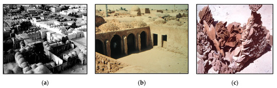 Two main building materials—sandstone and gypsum—are available in the region, and both were used in constructing the traditional quarters of El-Oued Souf’s settlements [35]. Sandstone (sand rose) (Figure 5c) is created when gypsum becomes encrusted with quartz sand, forming firm and resistant irregular shapes of crystallized stone in the overlay of the sand bed [36].