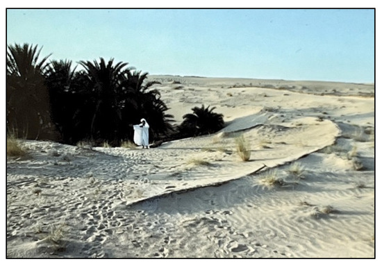 The region of El-Oued Souf is located in northeast Algeria (Figure 4) and lies in the sand dunes of the Grand Erg Oriental [27]. It extends over 54,573 km2 [28]. Human settlements such as the towns of El-Oued, Guemar, and Kouinine are situated in the middle of the sand dunes [29]. The region of El-Oued Souf is characterized by a typical hot and dry desert climate. Wind is the most important physical constraint on the structure of the buildings and the lives of the settlers. The Bahari, the prevailing wind blowing from the east to 80 degrees northeast, is quite violent, causing heavy sand storms. In the region of El-Oued Souf, the annual average wind speed reaches values up to 9 m/s, which is well above the critical wind erosion threshold for dry sand (around 7 m/s) [30,31]. As a consequence, wind-blown sands frequently cover the streets and squares, in addition to causing problems by sand encroachment around the buildings.