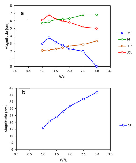 A total of seven building models were tested, each 8 cm long and 8 cm high, and 8, 10, 12, 14, 16, 20, and 24 cm wide, respectively. Figure 18a shows that when the building became wider, the dune around it became less curved: Ud and Ucd decreased, whereas Sd increased. The dune attached to the windward face of the model when W/L was about 3. The dune height (Uch) became higher, and the sand accumulation tail downwind from the building became longer (Figure 18b).