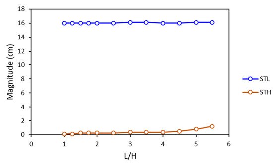 To test the effect of building height (H), experiments were performed with five building models, each 8 cm long (L) and 8 cm wide (W), and with heights of 8, 10, 12, 16, 20, and 24 cm, respectively. The following sand accumulation parameters were measured (see Figure 16): the upwind sand deposition distance (Ud), the sideway sand deposition distance (Sd), the upwind sand crest height (Uch), the upwind sand crest distance (Ucd), the sand tail length (STL), and the sand tail height (STH). Figure 17a shows that the taller the building, the larger the distance between the building and the surrounding dune: Both Ud, Sd, and Ucd increased with the normalized building height H/L. The height of the dune (Uch), on the other hand, did not change with the normalized building height. The length of the sand accumulation tail just downwind from the building (STL) decreased sharply when the building was higher (Figure 17b).