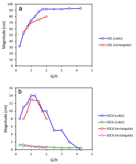Effect of gap size on sand accumulation for two cubic and two rectangular-shaped buildings next to each other. (a) Effect on SDL; (b) Effect on SDCd and SDCh. (See Figure 20a for explanation of symbols).