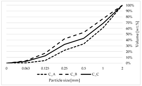 Dry sorted siliceous sands from local producer and supplier were used as aggregate. Three types (fractions) of silica sands (0.1–0.35 mm, 0.3–1.0 mm and 1.0–2.0 mm) from Provodínské písky a.s., construction and foundry grade were used in combination with quartz dust to produce a smooth distribution curve and produce a compact matrix of produced composite. In Figure 1, the distribution curve used in the experiments is shown.