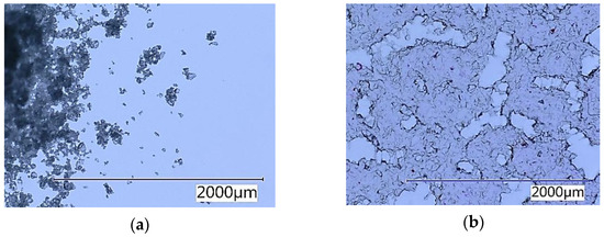 Structure of used SAP under the microscope with transmitted light: (a) dry SAP—magnification 150×; (b) SAP after water absorption and desorption magnification 150×.