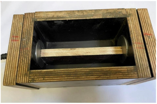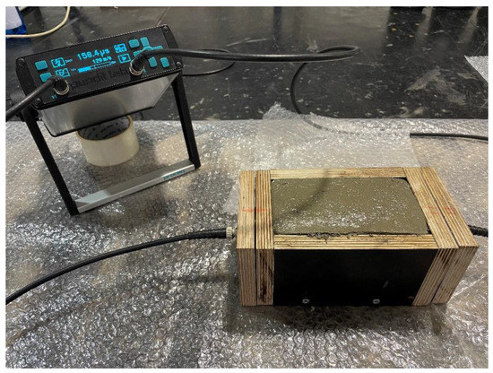 Fresh mortar was placed in a cell with 50 mm diameter holes made in its faces to accommodate 50 mm diameter probes. The measurement was carried out by the apparatus PUNDIT LAB for determination of transit time with an accuracy of 0.1 µm and a probe frequency of 54 kHz. The distance between the probes was set to 145 mm (length of measuring base) using the standard, and the probes were locked. The mold with fitted probes is shown in Figure 4.