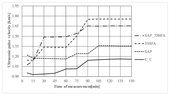 Acoustic methods (sound waves travelling through a material volume are analyzed for echoes and harmonic features) can be used for evaluation of material structure [34]. The measurement results are shown in Figure 12 (ultrasonic pulse velocity) and Figure 13 (dynamic Young’s modulus of elasticity).