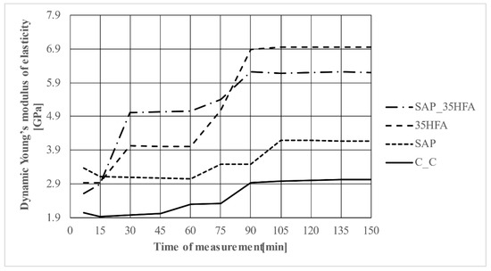 As a result of the different composition of mixtures, there is also a different process of their hydration; there is a different formation of hydration products over time and thus also a different formation of its internal structure. This is evident from the results of the method in Figure 12 and Figure 13, where subsequent stagnation of the propagation speed of the ultrasonic pulse or dynamic modulus of elasticity can be observed. The propagation speed stopped changing after approximately 90–105 min from mixing. The dynamic Young’s modulus is dependent mainly on the composition of the mixture. In concrete, the Young’s modulus is most dependent on the used aggregate. For this study, the same aggregate was used for every mixture, therefore, the above results are mainly dependent on the used admixture (SAP), substitution of cement by HFA and the amount of mixing water. After a certain period of time, specifically after 45 to 105 min, the mentioned parameters (V, EU) stagnate over time—their differences are minimal up to 1%; this phenomenon can be explained by the fact that after this time the mortar begins to solidify.