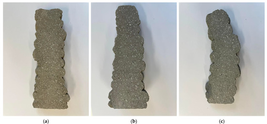 For printing purposes, three filler curves were used, as shown in Figure 1 and Table 6. The C_A mixture contained only silica sand of fraction 0.1–2.0 mm. The filler curve (sieve analysis) shows the C_A curve is coarse; therefore, the amount of mixing water is lower to achieve the optimum consistency. The C_B mixture contains, in addition to the 0.1–2.0 mm silica sand, quartz dust. The filler curve is very fine and therefore needs more mixing water to achieve correct consistency. The C_C curve was treated to represent the ideal Fuller filler curve and the properties of such a curve were shown to be very good in terms of 3D printing.