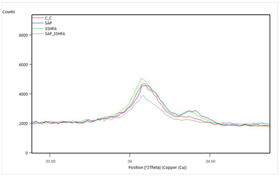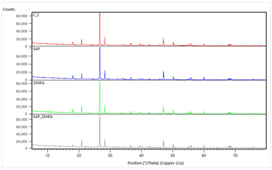 The refinement of minerals crystal structures was realized by the Rietveld analysis with the percentual occurrence of minerals shown in Figure 17. According to this analysis, the higher proportion of alite genesis in samples without fly ash addition is observed. Slight decrease of the calcite genesis as a consequence of SAP addition was observed. In samples with content of SAPs, lower presence of quartz and higher occurrence of amorphous phase in comparison with samples without SAP was observed.