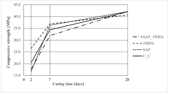 The compressive strength of test samples was determined after 2, 7 and 28 days of curing. The highest early age compressive strength was achieved for the 35HFA mixture and the highest compressive strength after 28 was the exact for the SAP_35HFA and the SAP mixture. The strengths are shown in Figure 18.