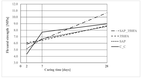 The flexural strength of test samples was determined after 2, 7 and 28 days of curing. The highest flexural strength was achieved for the SAP_35HFA mixture. This result was achieved by a combination of effects of adding both SAP and HFA to the mixture. The strengths are shown in Figure 19.