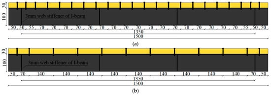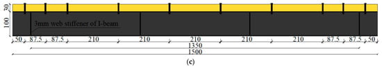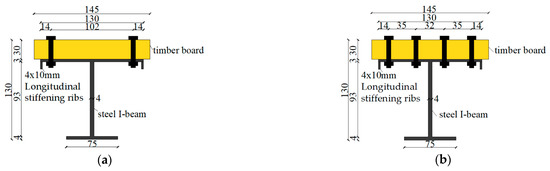 Nine TSC I-beams were designed and constructed. These specimens were divided into four groups (one specimen in L1, four in L2, two in L3, and two in L4), and bending tests were conducted under simply supported conditions. The span, section height, width, top board, and I-beam dimensions of the four groups were identical, except for the bolt arrangement parameters. Timber boards and I-beams were connected with ordinary bolts. Because the focus of this paper is to investigate the effect of the bolt arrangement as a single variable on the flexural performance of composite beams, the boards were polished, sanded, and then coated with tung oil, a solvent-based coating that increases water resistance, in order to reduce the effect of shrinkage on relative slip due to water absorption in the timber boards. Furthermore, to reduce the influence of other factors, such as the friction coefficient of the timber–steel interface, on the relative slip, the surface of the timber boards was polished and evenly coated with epoxy resin as a transition layer, and the surface of the steel beam was carburized before the bolts of the specimen were assembled. The cross-sectional dimensions of the specimen are shown in Figure 1. The height and width were 130 and 145 mm, respectively, the thickness of the top board was 30 mm, the height of the I-beam was 100 mm, the thicknesses of the bottom plate and web plate of the I-beam were 4 mm, and the thickness of the top plate was 3 mm. The longitudinal dimensions of the specimen are shown in Figure 2. The total length of the beam was 1.5 m, and the calculated span was 1.35 m. Longitudinal 4 × 10 mm stiffening ribs were placed on the exterior of the top plank to enhance the longitudinal stability of the upper edge of the I-beams. The L3 group had no longitudinal stiffeners on the outer edges of the flange, except for L3-1. Note that L3-1 was compared with L3-2, which had stiffening ribs.