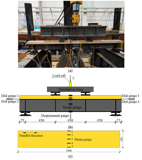 The experiments were conducted in the laboratory of the School of Civil Engineering, Central South University of Forestry and Technology, Hunan, China. In order to reduce the effects of temperature and humidity on the specimens and to highlight the effect of bolt arrangement as a single variable on the relative slip in the flexural performance of the composite beams, we controlled the dryness and temperature of the material to be consistent with the dryness and temperature of the experimental environment to reduce the effect of shrinkage on the specimens. The loading device arrangement shown in Figure 3a includes a 100 T reaction frame and 100 T hydraulic jack, and the load was simultaneously measured with a 30 T load sensor. In accordance with the European Code EN14545 [13], three-point bending tests were conducted on the composite beam. Before loading, the test instrument was checked to work properly by preloading the specimens to 15% of the estimated ultimate bearing capacity. Note that graded loading was used in the early stage of the actual tests. Before the 40 kN load, 5 kN was loaded in each stage and maintained for 30 s. After 40 kN, a 3 kN load was added to each stage and kept for 15 s. When the load sensor rebounded slightly, the load was added by a 1 mm increase in midspan deflection. Ultimate design strength, as defined by Yuan et al., is the absence of significant strength damage to the composite beam. When the midspan deflection reached 1/27 of the calculated span diameter, i.e., the midspan deflection was taken as 50 mm in this paper, the STC beam did not reach the peak load yet. Although the load-carrying capacity could still continue to increase, the deflection was considered to be too large, and it was assumed to have lost its actual value. Therefore, the maximum load was regarded as the limit state design standard value, and the test was completed.