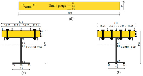 For this experiment, the DH3861 static strain acquisition system and dial indicator were used to measure and read the strain and displacement of the beams, respectively. Dial indicators were installed on each of the flange boards and at the left and right ends of the I-beams to test the relative slip between the boards and I-beam. A displacement gauge was arranged at the bottom of the span of the beam to test the span deflection of the beam, as shown in Figure 3b. The strain gauge arrangement is shown in Figure 3e,f. In addition, 15 longitudinal strain gauges were arranged across the midsection to test the normal strain. Five longitudinal strain gauges (No. 1–5) were arranged transversely on top of the board, three longitudinal strain gauges (No. 6–8) were arranged along the height of the board, four longitudinal strain gauges (No. 9–12) were arranged along the height of the I-beam web, and three longitudinal strain gauges (No. 13–15) were arranged on the bottom of the I-beam.