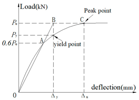 The yield point, as defined by Feng and Qiang [17], is a key performance point for the transition of engineering structure from elasticity to plasticity. As shown in Figure 4, the yield point strength was calculated by Park’s method [18]. In this method, we first determine Point A of 0.6 Pu on the load–displacement curve in Figure 4. Then, the OA line was extended to intersect with the horizontal line of the maximum load Point C at point B. Then, a vertical line of horizontal coordinates across Point B was made to intersect the curve at the yielding point. Finally, the value of the vertical coordinate of the yielding point was the yielding strength. The displacement ductility coefficient () was used to quantify the ductility performance of the member. This coefficient is calculated as follows:
