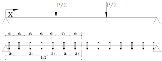 where and are the relative slips of each section of the bending-shear section and the pure bending section under the action of three equally divided point loading. In addition, and are calculated span and beam length, respectively, and and are constant. The calculation method is presented in Equation (14).