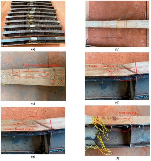 Phenomenon of test specimen: (a) the lower edge of I-beam is not broken (Note: All test specimens); (b) the timber is free of damage (Note: L1-1 test specimen and L4-2 test specimen); (c) longitudinal cracks of the bending-shearing section on the top surface of timber board (Note: L2-1, L2-4, L3-1, L3-2, and L4-1 test specimen); (d) longitudinal fracture of tensile zone of timber (Note: L2-1 test specimen); (e) the compression area of the timber is crushed (Note: L2-1, L2-2, and L3-1 test specimen); (f) buckling of upper flange of I-beam (Note: L3-1 test specimen).