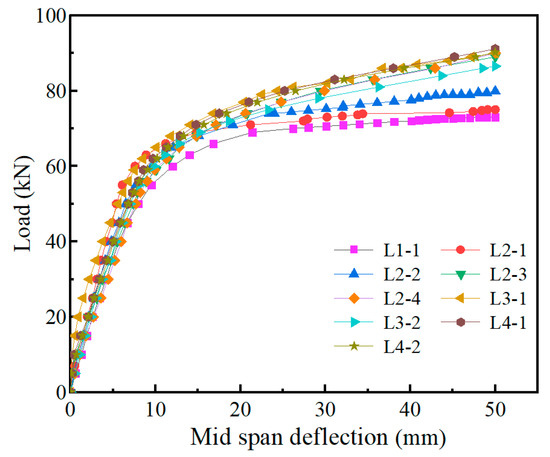 Figure 10 shows the load–midspan deflection curve of nine wood steel composite beams. When the midspan deflection of each group of test specimens reached 50 mm, the load was stopped. According to the test process and results, the stress states of all the composite beams, except for L1-1, can be divided into three stages: elastic, elastic–plastic, and plastic. In the elastic stage, the slopes of the specimens arranged with the same bolt parameters were more or less the same. When the increasing rate of the midspan deflection was small, the bending load of the composite beams increased rapidly. In the elastic–plastic stage, the midspan deflection increase rate of the composite beams gradually surpassed that of the flexural load. In the plastic stage, when the bending load increased slightly, the midspan deflection increase rate was also large, and the load–deflection curve gradually leveled. However, up until the loading was stopped, there was no obvious descent of the load–deflection curve, and the specimens showed good ductility.