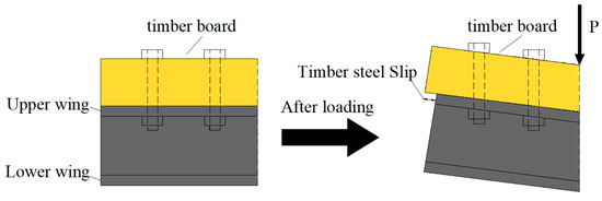 During the loading and bending process of the composite beam, the bolt connector deformed due to the longitudinal horizontal shear force at the interface. The tilt or deform caused relative slip at the timber–steel interface of the composite beam specimen, which, in turn, caused the flexural capacity of the composite beam to decrease. The relative slip of the timber–steel composite beam is shown in Figure 11. This test was carried out using a dial indicator to improve the accuracy of the relative slip value. During the slip process, the outward extension of the board was positive, and the inward retraction of the steel web was negative.