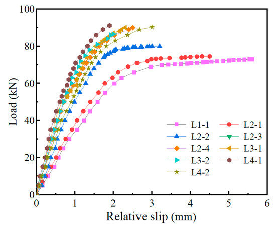 Figure 12 illustrates the load–slip curves of each specimen. When the load was small, the relative slip increased linearly with the load. However, when the stress reached the yield stage, the slip increased nonlinearly with the increase in load, so a smaller increase in load caused a larger increase in slip. The maximum slip value of each specimen was in the range of 2–6 mm, among which L4-1 had the smallest slip peak, and L1-1 had the largest slip peak.