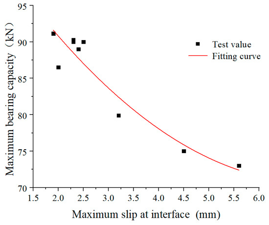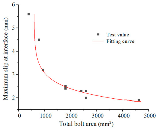 As shown in Table 6, this paper proposes the concept of total bolt area to quickly select bolt arrangements with minimum relative slip to satisfy engineering applications. The total area of the bolts was taken as the product of the number of bolts on the top surface of the test specimen and the tangential area of a single bolt. Determination of the total area of the bolts facilitated free bolt arrangement. Figure 13 shows the relationship between the maximum slip of the specimen interface and the total area of the bolt. It can be seen that as the total area of the bolt increased, the maximum slip of the interface gradually decreased. When the total bolt area was less than 1800 mm2, the slip curve decreased rapidly, and then the curve decreased slowly. Thus, considering the number of bolts for economic and anti-slip performance, the optimal bolt area ratio (k) is 8 × 10−3, which has a corresponding maximum slip of about 2.5 mm, as demonstrated by L2-3 and L2-4, as shown in Table 6. The bolt diameter was 5 mm, the longitudinal distance was 70 mm, and there were 4 transverse rows of bolts.