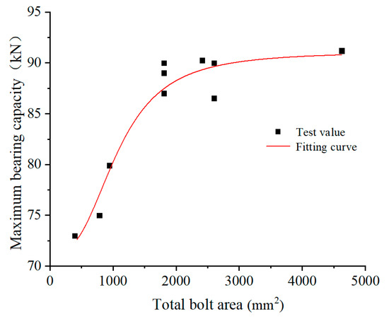 Figure 14 shows that the ultimate bearing capacity of composite beams decreased almost linearly with the increase in interface slip. Figure 15 shows that the maximum bearing capacity value increased gradually as the total area of the bolt increased. When the total bolt area is less than 1800 mm2 (k = 8 × 10−3), the bearing capacity curve rises faster, and then the curve rises slowly. Considering the number of bolts for comprehensive economic and load-bearing performance, the bolt area ratio k = 8 × 10−3 is desirable, which has a maximum slip of about 2.5 mm, as demonstrated by L2-3 and L2-4, as shown in Table 6. The bolt diameter was 5 mm, the longitudinal distance was 70 mm, and there were 4 transverse rows of bolts.